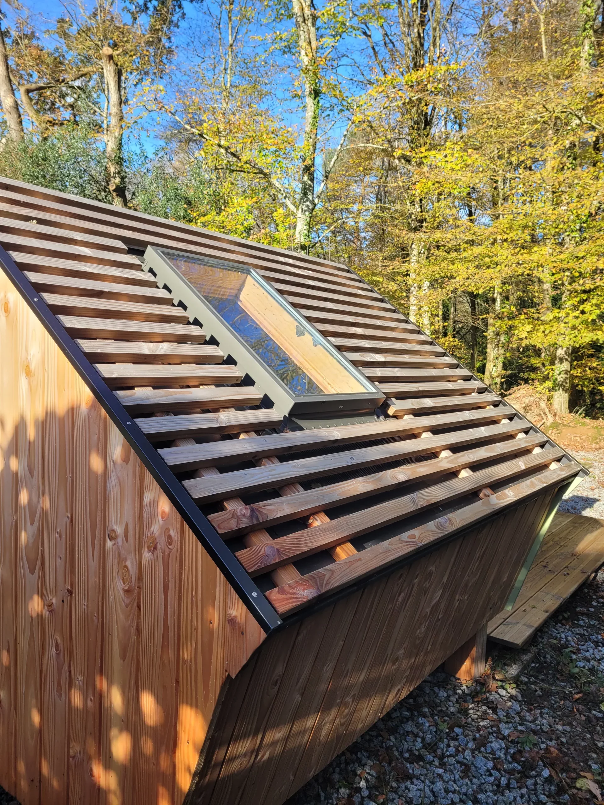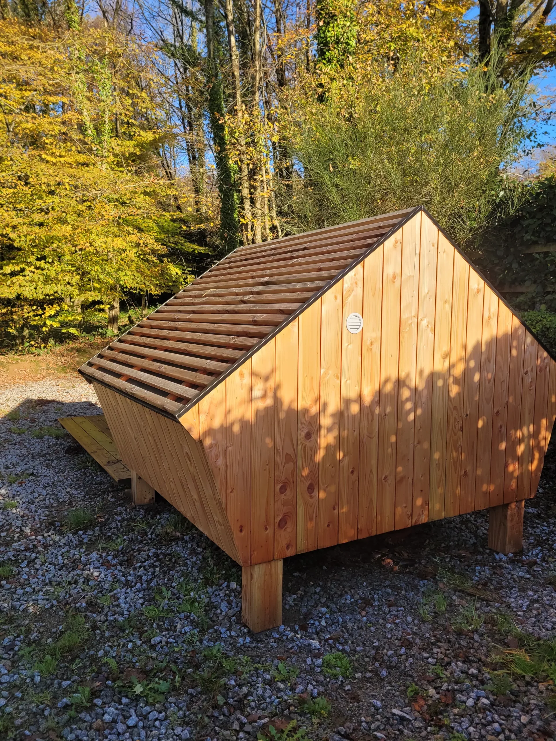 Cette cabane en bois pour 2 personnes est dotée de 2 couchages, d’un espace de rangement et de volets en bois occultants.